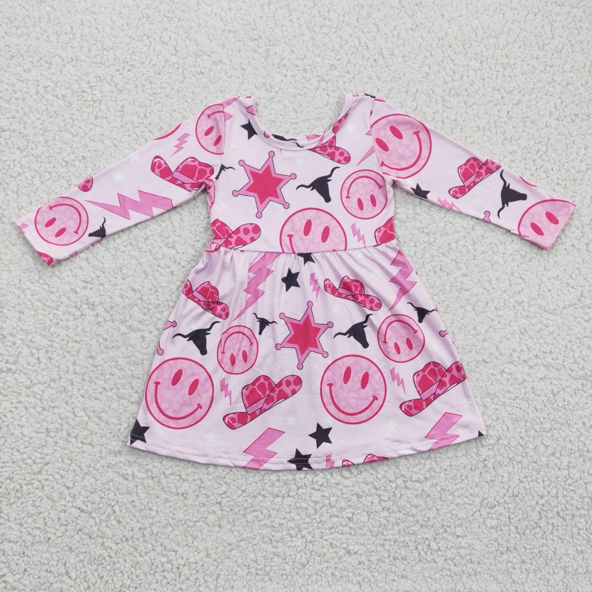 11.10 RTS NO MOQ(In Stock ) GLD0170 Girls Hat Smiley Lightning Lightning Pink Long Sleeve Dress
