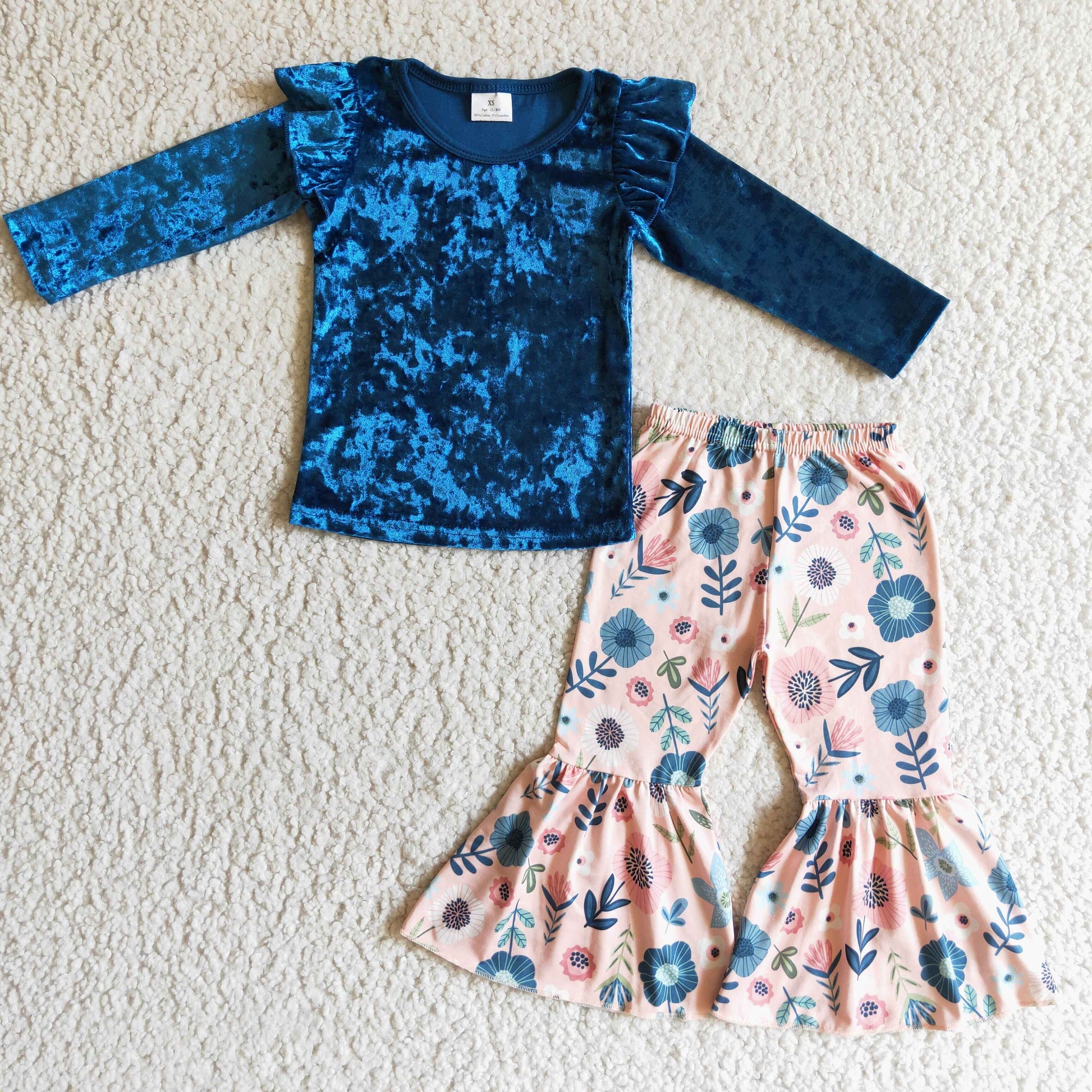 11.3 RTS NO MOQ(In Stock ) GLP0220 girls outfit gold velvet long sleeve and long pants flower print