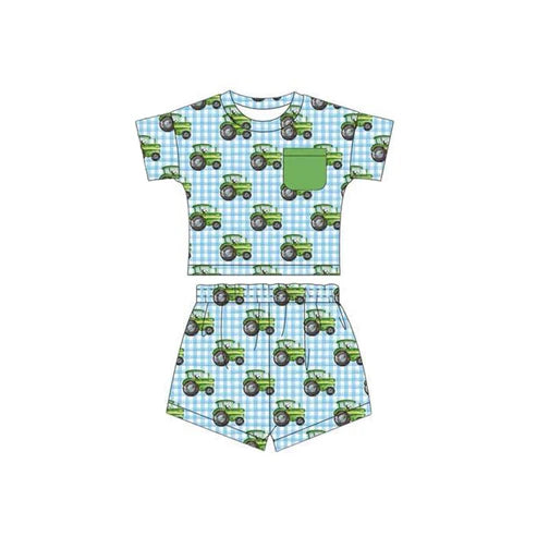 6.9 BSSO1539 Baby Boys Short Sleeves Blue Plaid Trucks Pocket Top Short Farm Pajamas Set Preorder