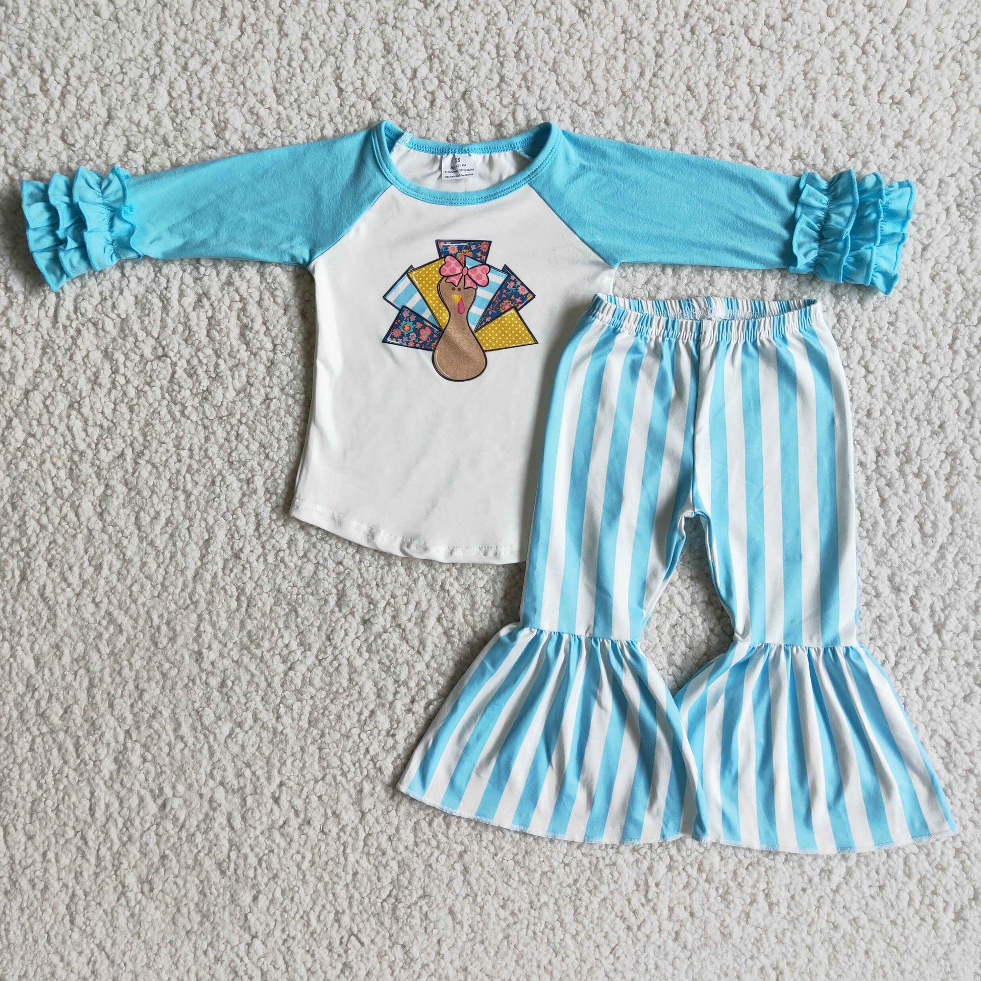 6 A4-16 Thanksgiving turkey blue striped girl set