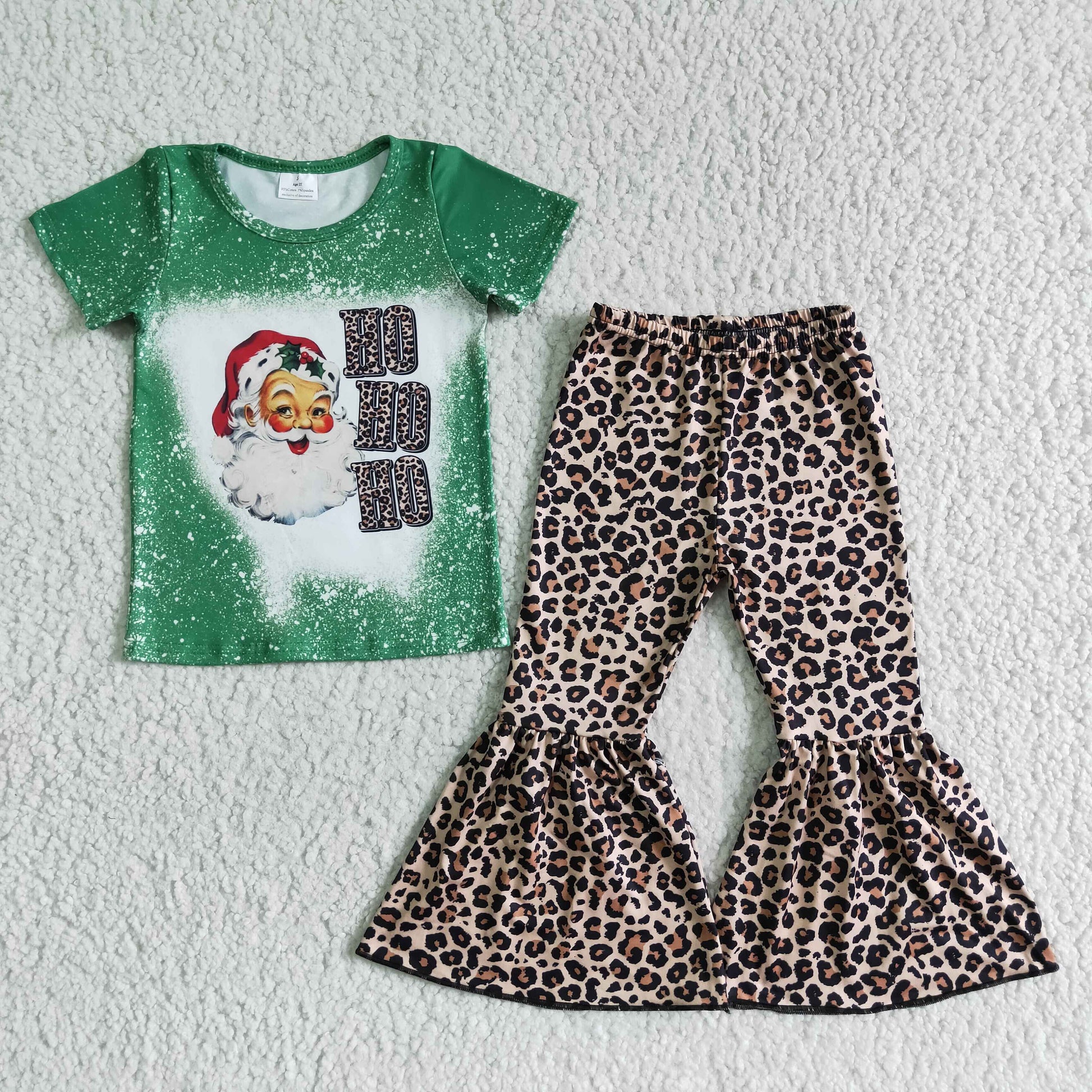 D1-5 Green Santa Claus print short-sleeved top with leopard-print flared pants