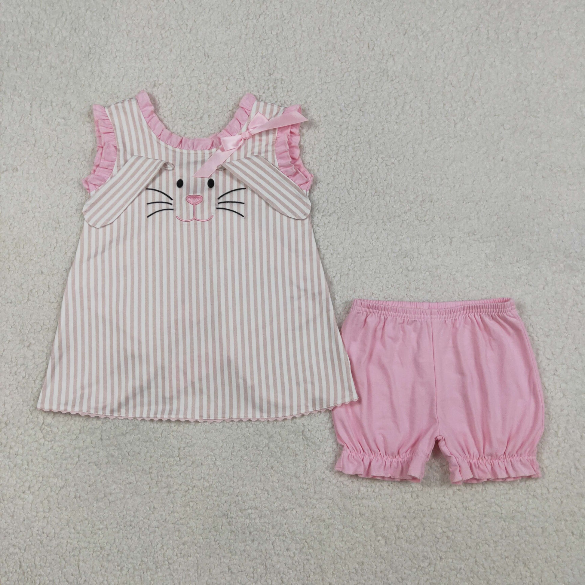 GSSO2924 Kids Embroidery Rabbits Baby Girls Back Bows Stripe Tunic Ruffle Shorts Easter Sets