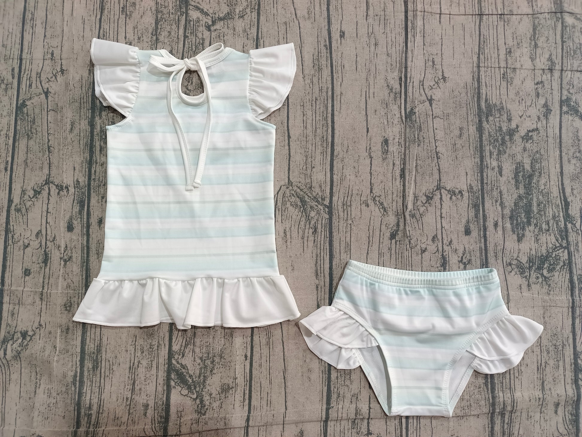 Pre-order Baby Girl Aqua Stripe Ruffle Top Bummies 2 Pieces Swimsuits Set S0652