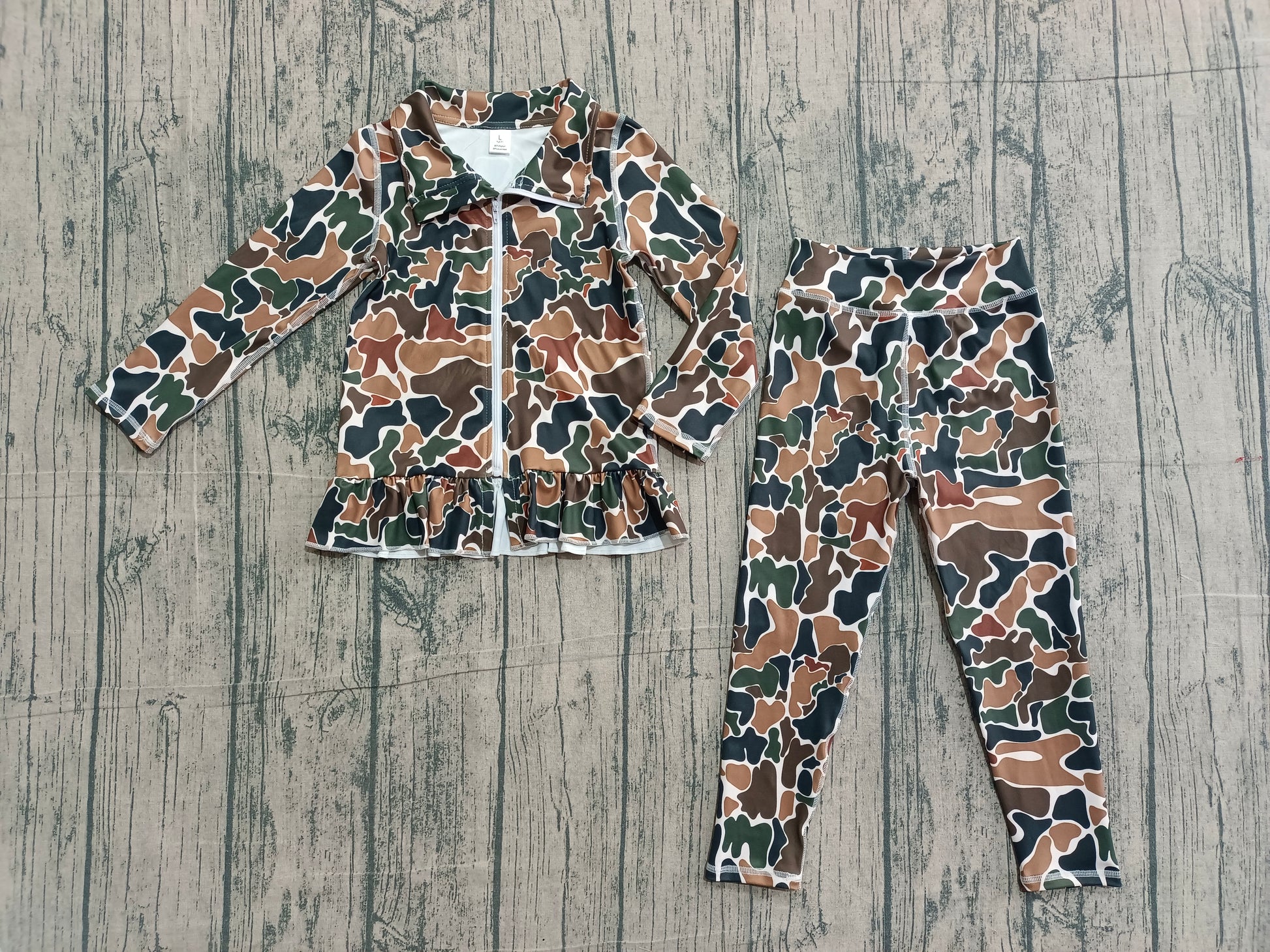 Pre-order Baby Girl Dark Brown Camo Zipper Jackets Ruffle Top Leggings Pants Yoga Clothes Sets GLP2992