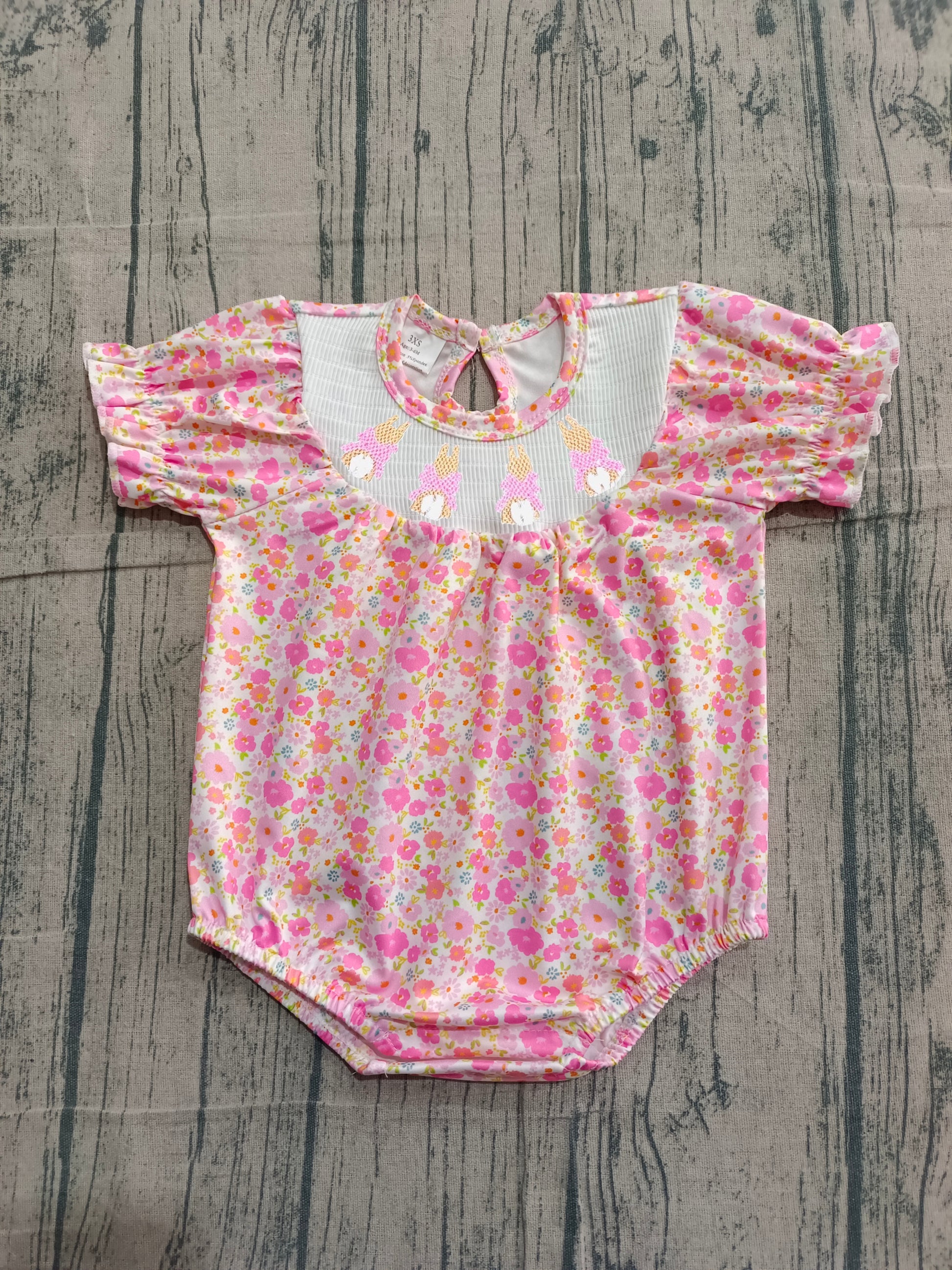 Pre-order Baby Girl Short Sleeve Smocked Embroidery Rabbit Ruffle Bubble Rompers SR3785