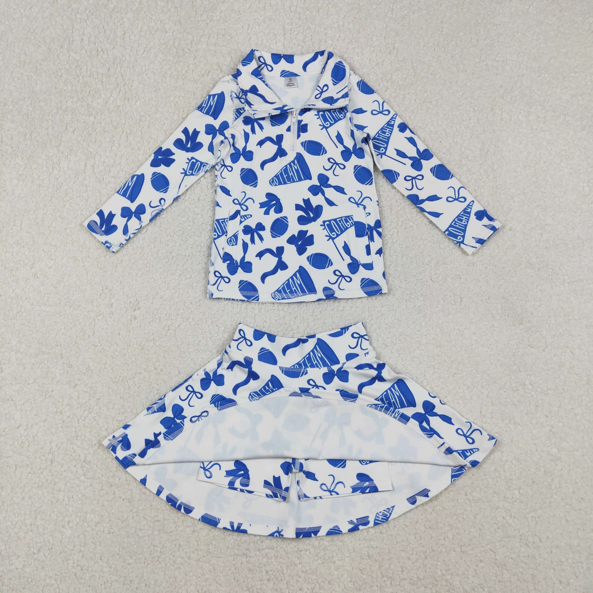RTS NO MOQ(In Stock) Baby Girls blue Bows Go Team zipper long sleeve top Yoga skirts Set
