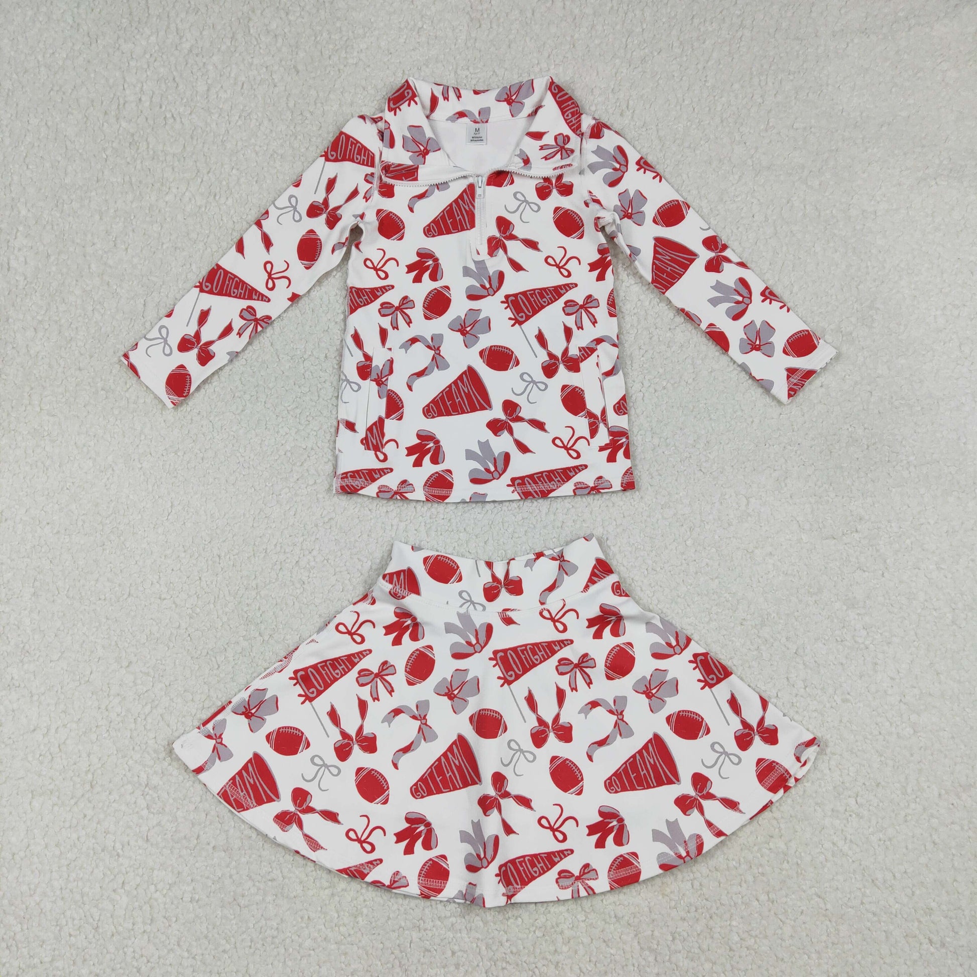 RTS NO MOQ(In Stock) Baby Girls red Bows Go Team zipper long sleeve top Yoga skirts Set