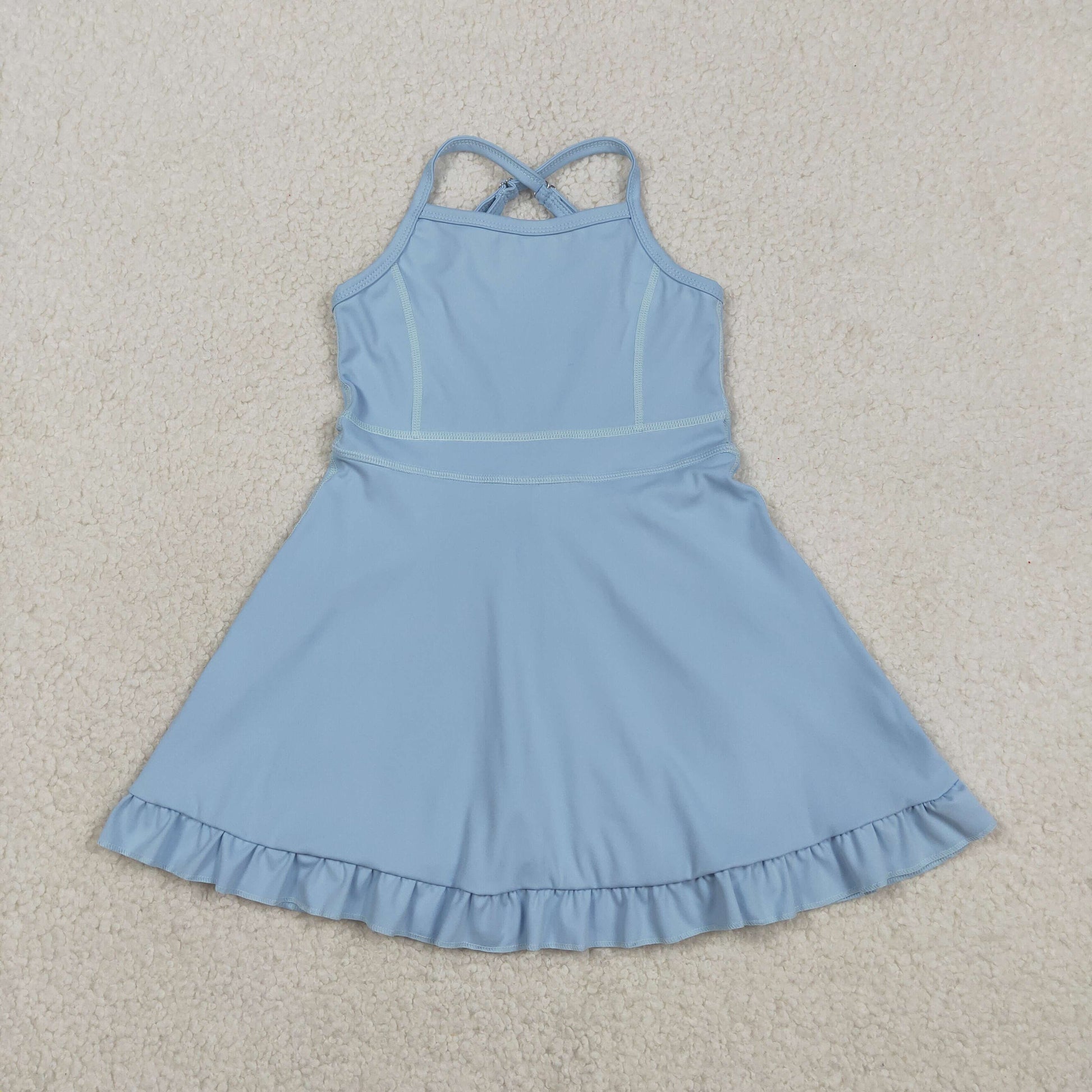 S0713 Kids Baby Girl Light Blue Strap Yoga Active Shorts Ruffle Knee Length Dresses